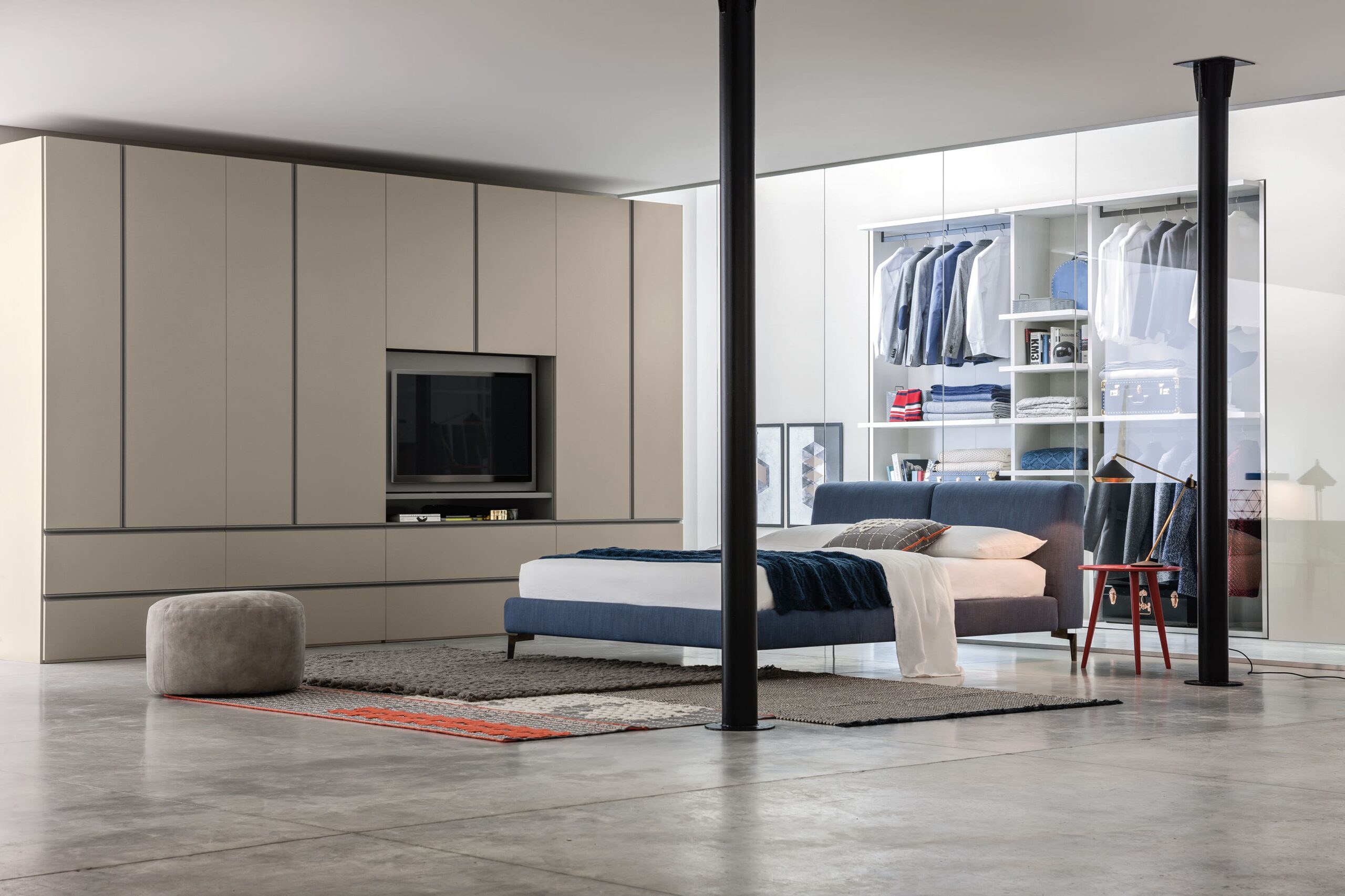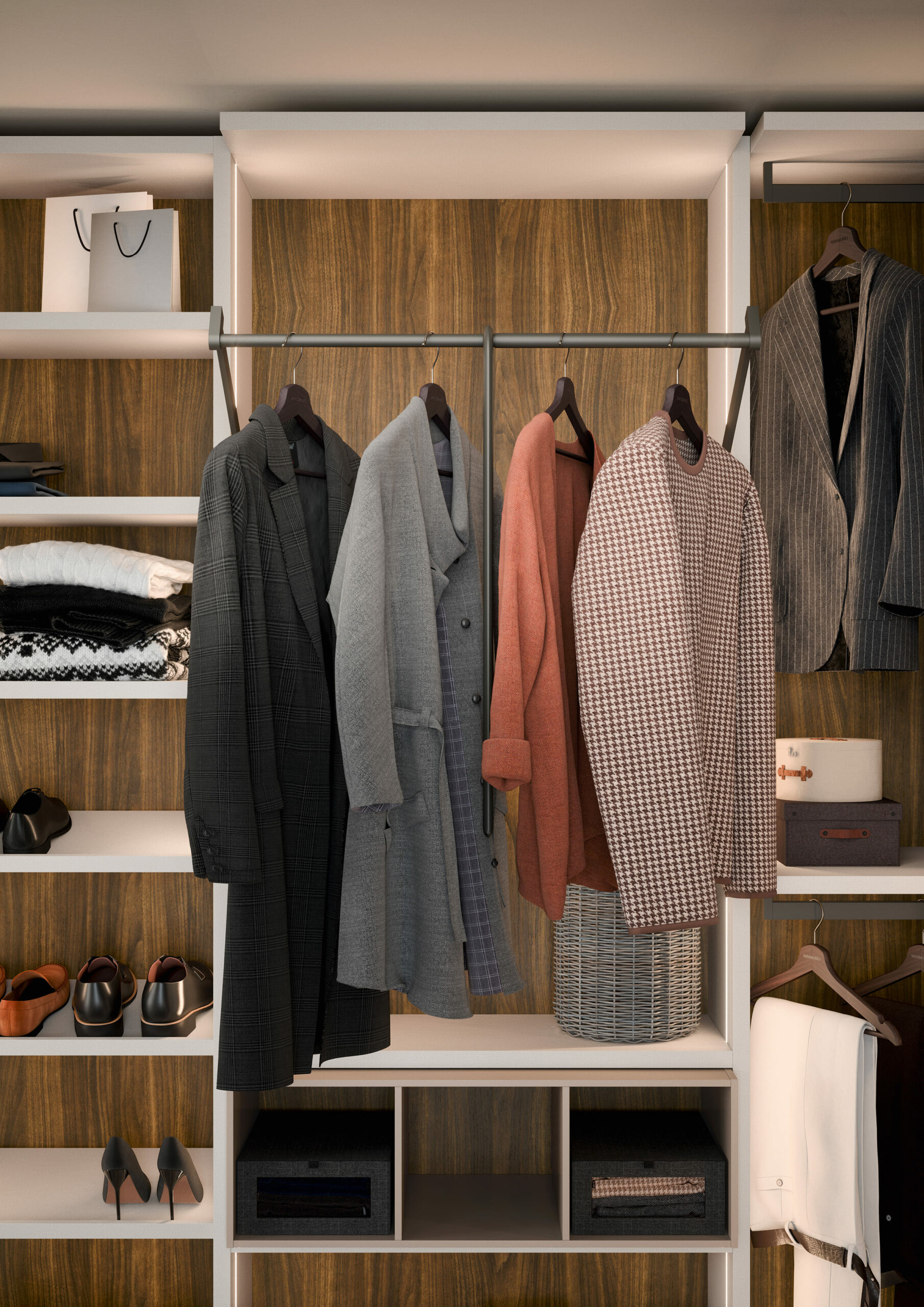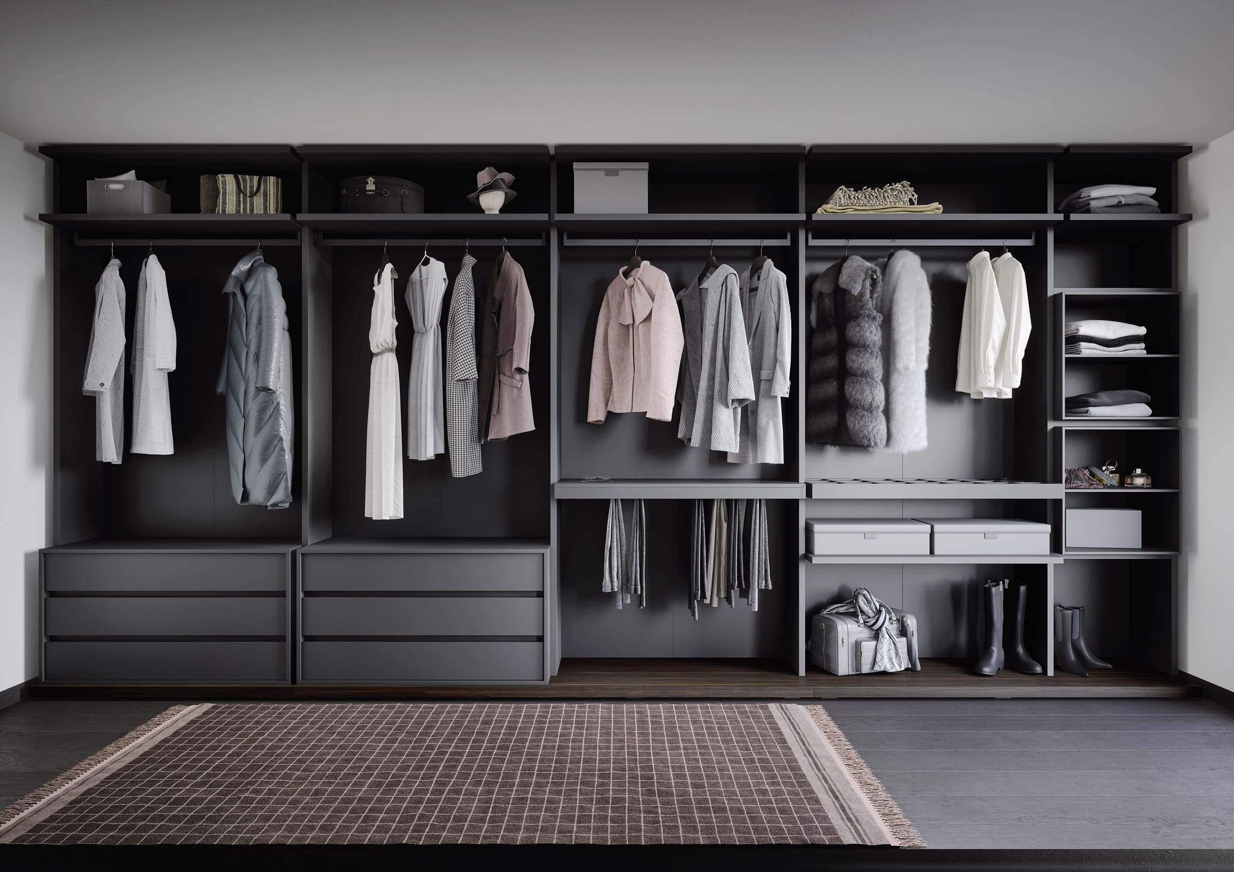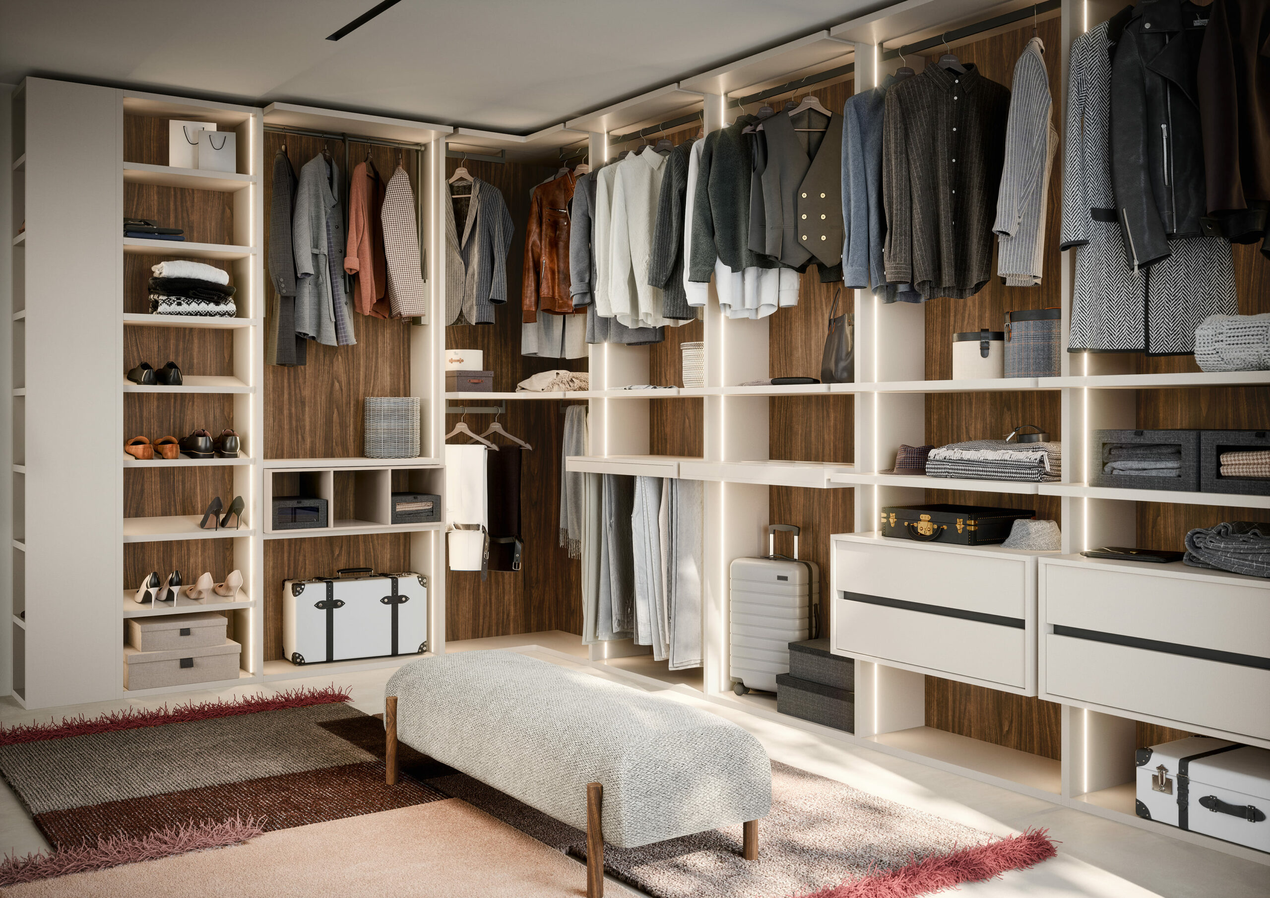La moderna cabina armadio Ben è componibile e attrezzabile con cassettiere, ripiani flat o fold, moduli angolari, portapantaloni e portacravatte, ripiani portascarpe, tubo appendiabiti, vani a giorno e ante.