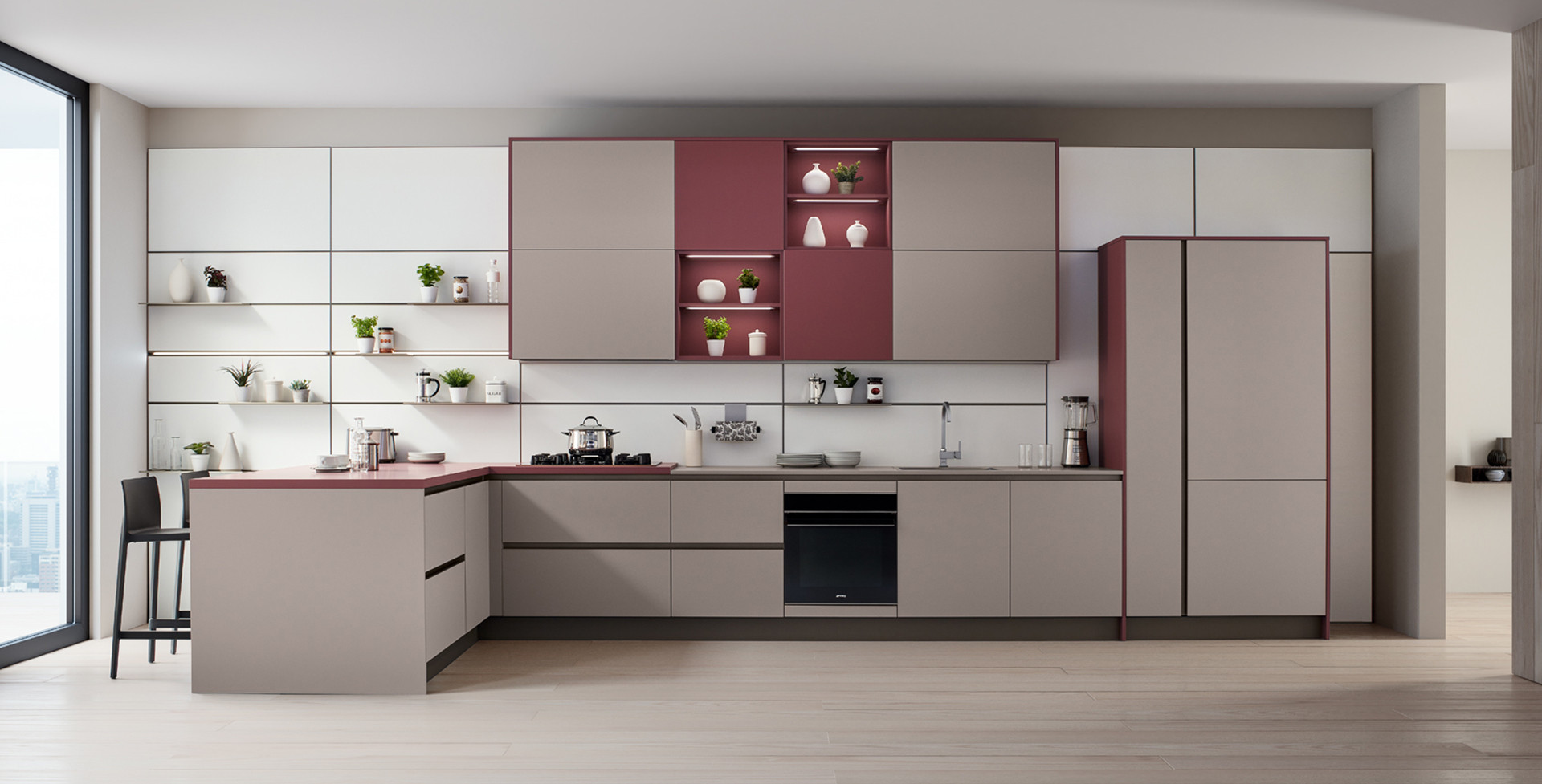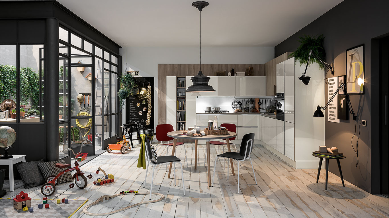 Like interpreta i concetti di semplificazione creativa, nuove funzionalità, immediatezza e personalizzazione, proponendo una tipologia di anta bordata effetto vetro con profilo in tinta e color alluminio.