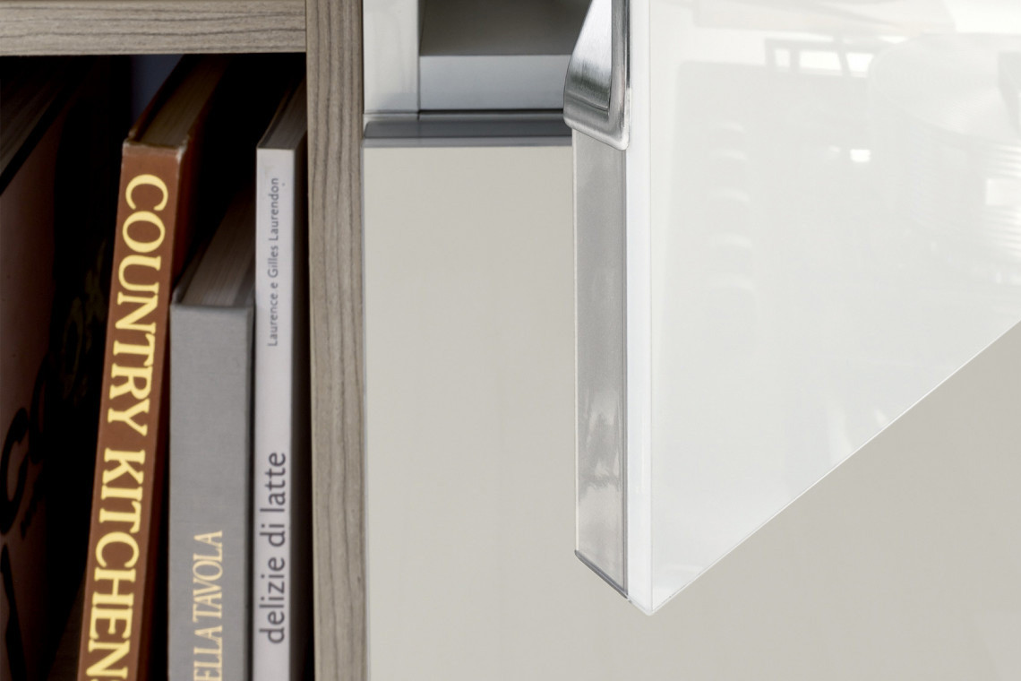 Like utilizza i diversi sistemi di apertura di Veneta Cucine: la tradizionale maniglia o la gola ‘J’ che può, a sua volta, essere combinata con il profilo PRO sul bordo dell’anta, per facilitarne l’apertura.