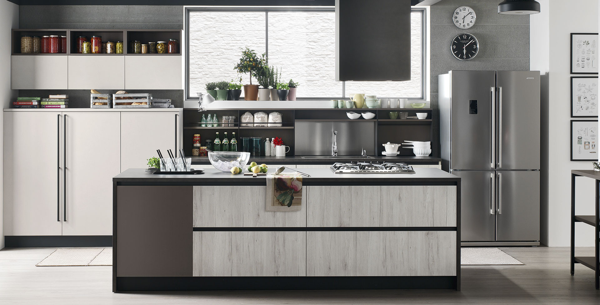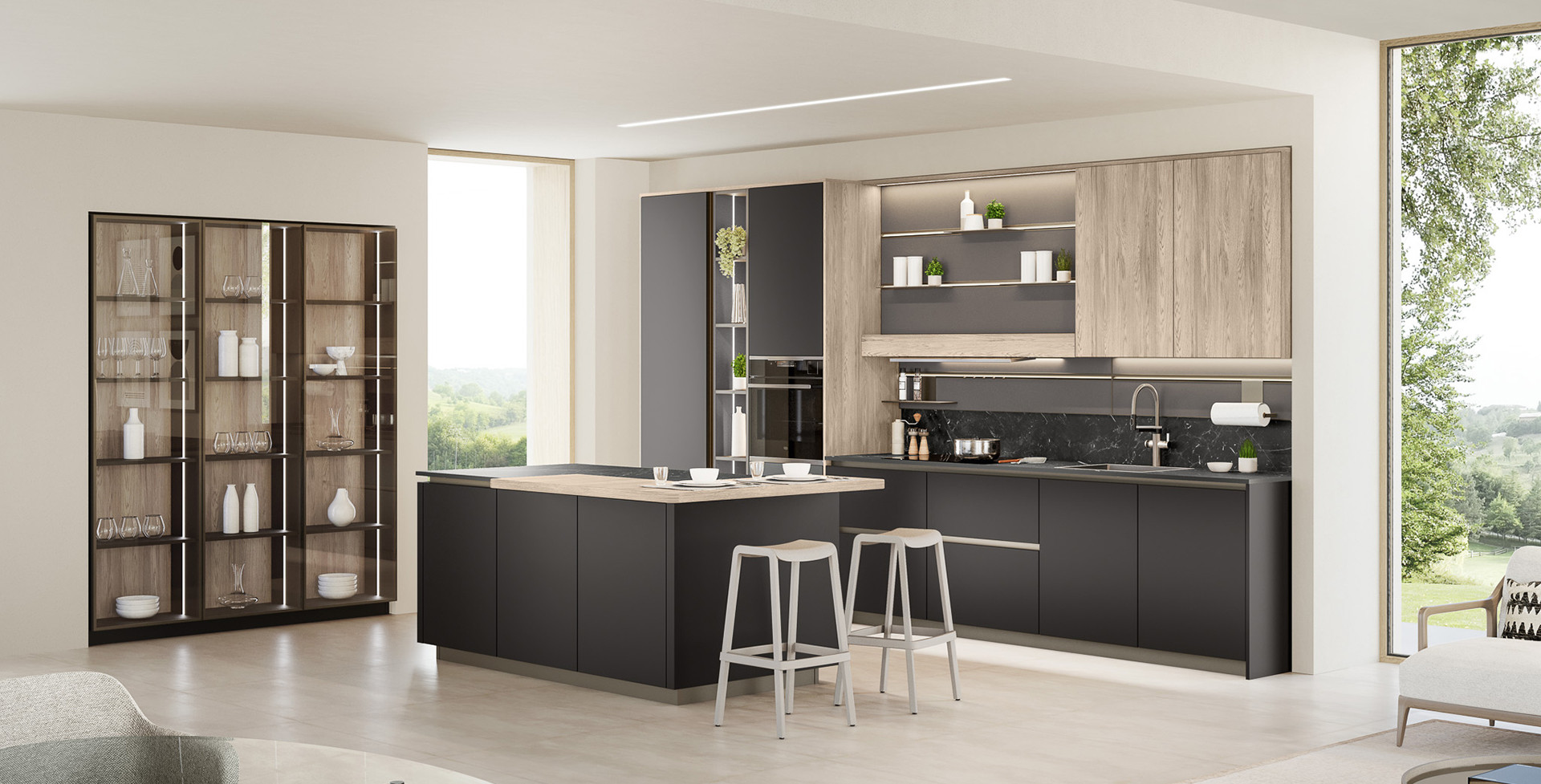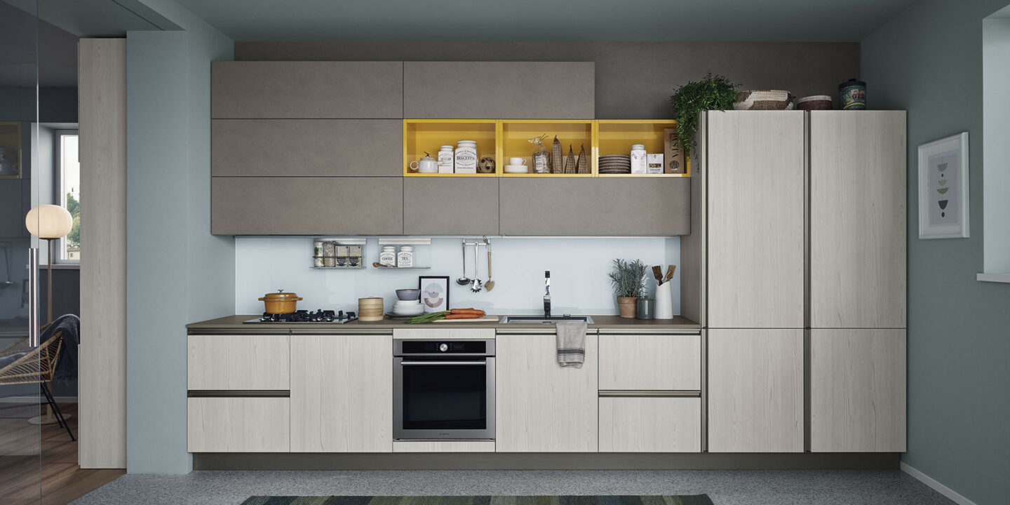 START-TIME: partire con il piede giusto, conferendo allo spazio cucina il sapore giovane di un design dalle linee pure, vestito di colori cool e finiture legno in trend con le tendenze che guardano alla naturalità. La presa integrata di Start-Time si aggiunge al sistema di apertura con gola di Start-Time.Go che utilizza la comoda maniglia a incasso, al sistema con profilo J e alla ‘tradizionale’ maniglia.
