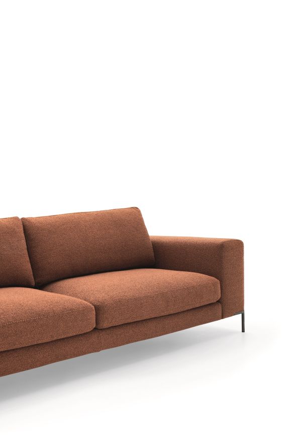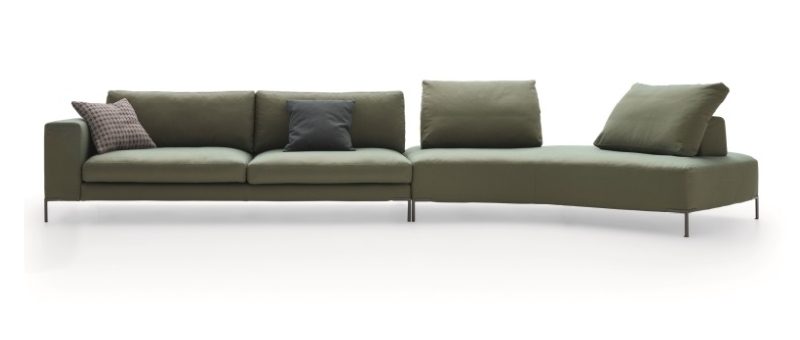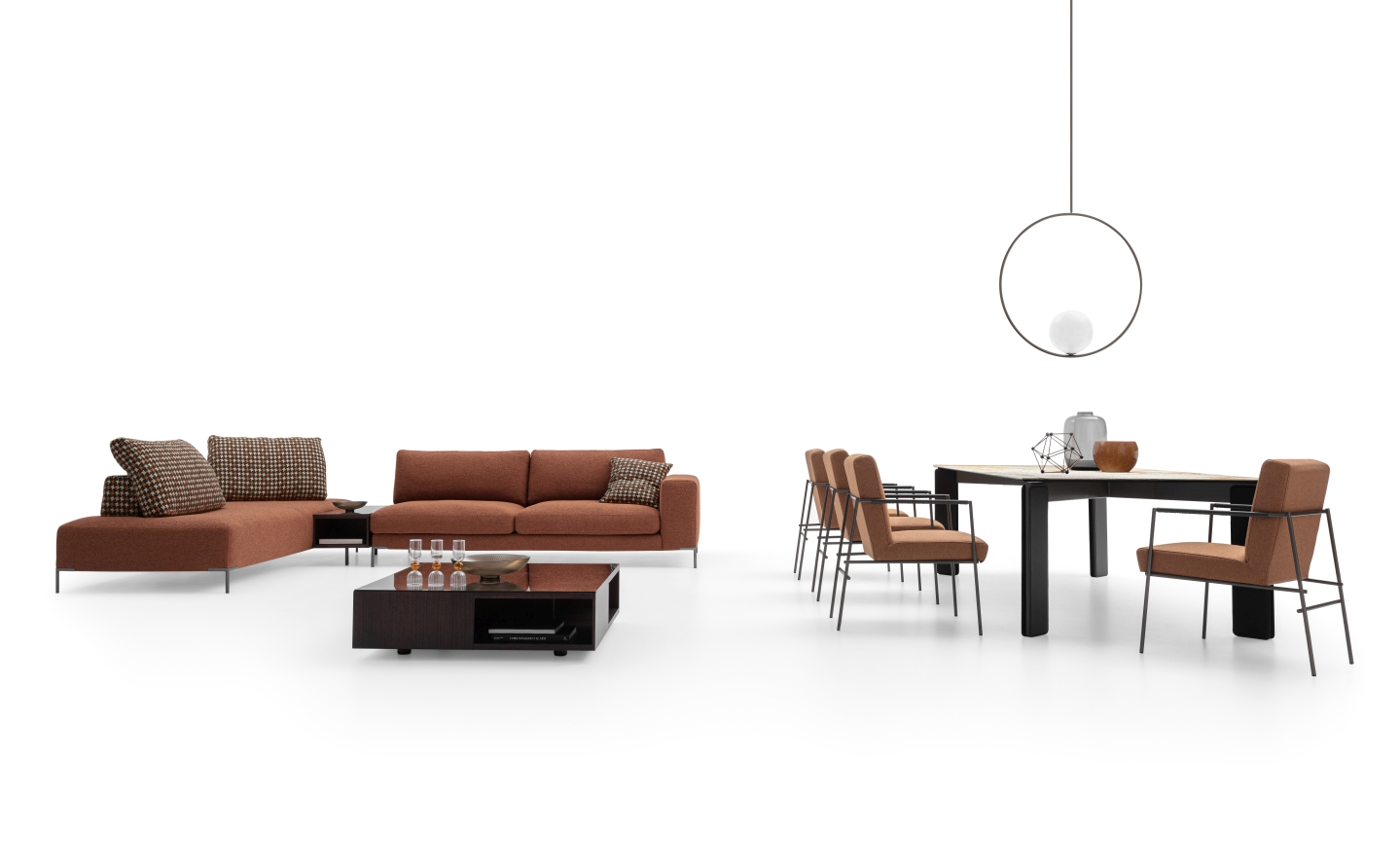 Un sistema modulabile tra basi monoscocca sospese, basi a cuscino mobile e coffee table in due misure. Nella versione monoscocca lo schienale libero permette configurazioni vis a vis o bifacciali da centro stanza.