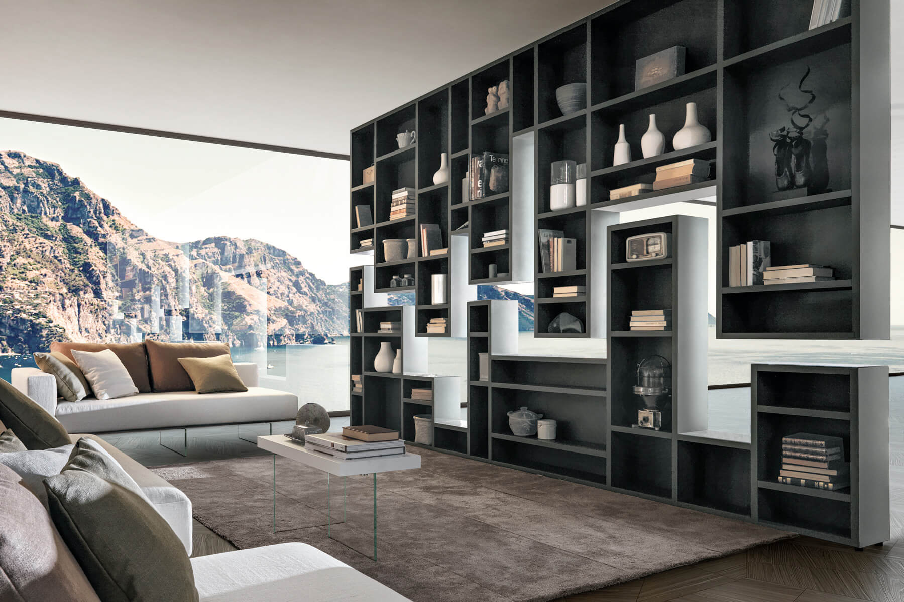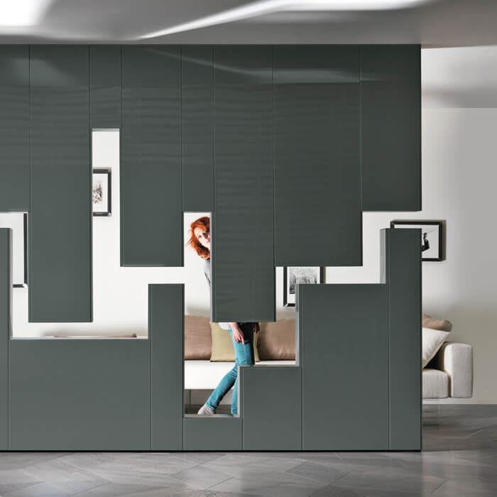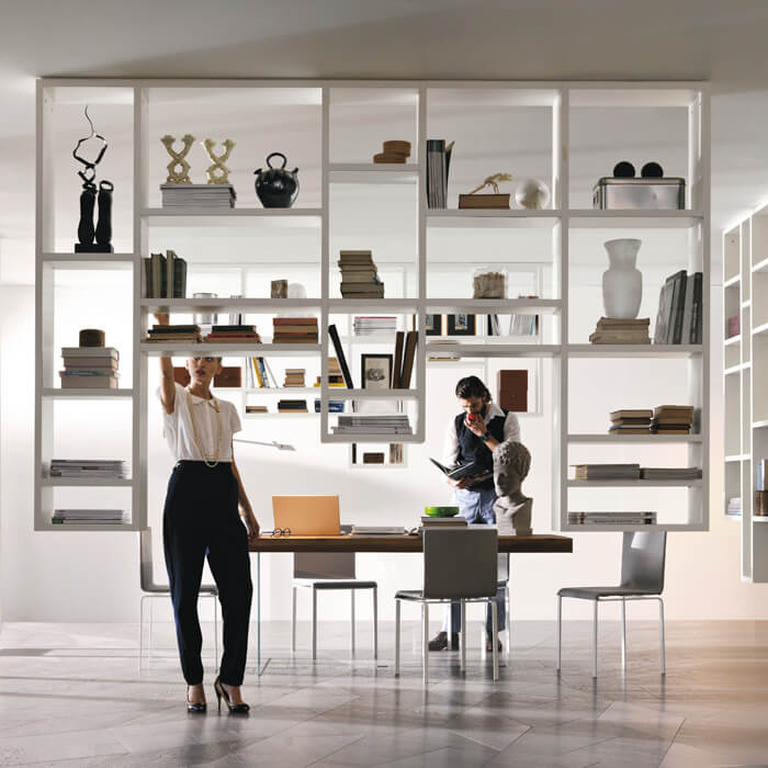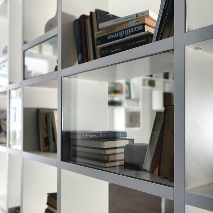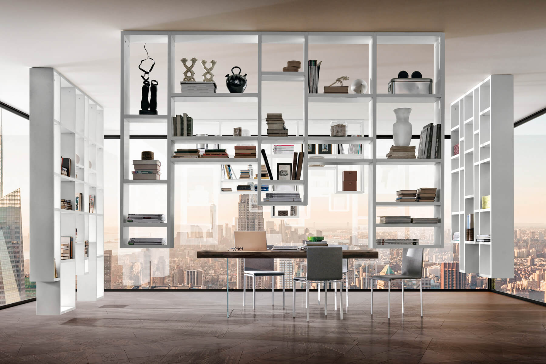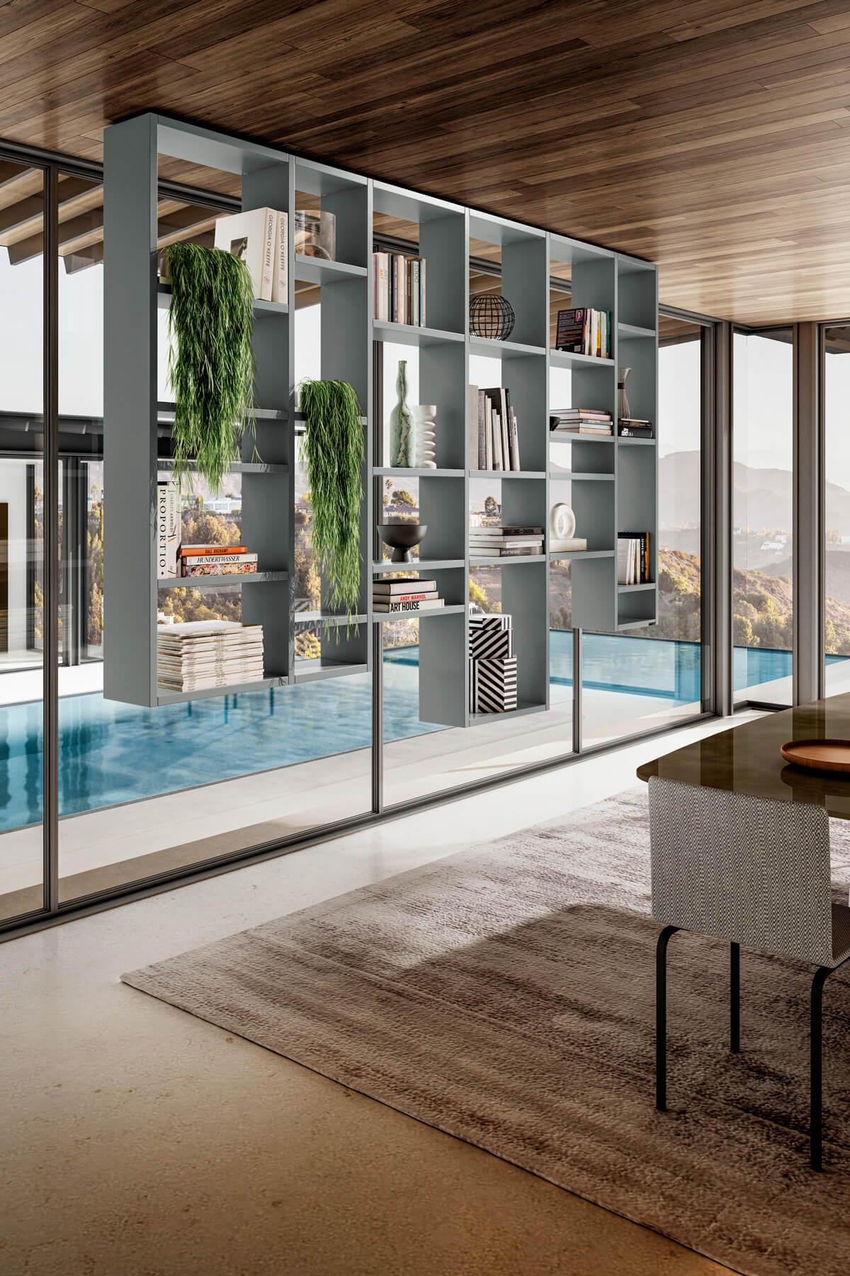 Il coraggio di innovare ha portato a sospendere la libreria 30mm al soffitto, creando scenografiche composizioni che scendono dall’alto e che aiutano ad organizzare e dividere lo spazio in modo originale. Le colonne, di lunghezze diverse, scendono dal soffitto dando vita a un dinamico gioco di sospensione. Nella soluzione a giorno, la luce filtra liberamente, rendendo gli ambienti leggeri; le librerie con schienali danno vita a vere e proprie pareti divisorie. Un sistema di installazione sviluppato e testato in collaborazione con Fischer garantisce massima tenuta e sicurezza.